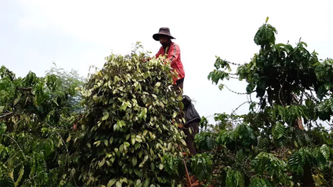 Thu hoạch tiêu tại xã Ia Vê, huyện Chư Prông, tỉnh Gia Lai. Ảnh: HOÀNG THANH