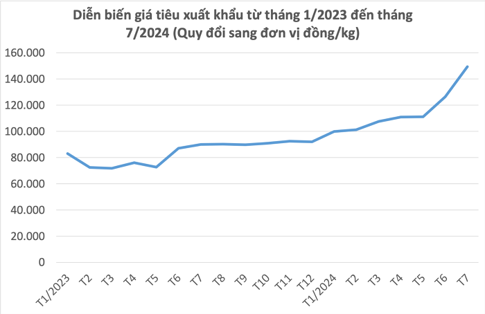 Nhìn bức tranh rộng hơn, giá tiêu đã có đợt tăng phi mã trong năm nay khi mức hiện tại cao gấp đôi so với đầu năm. Đỉnh điểm hồi tháng 6, giá tiêu đạt gần đỉnh 8 năm ở mức 180.000 đồng/kg.