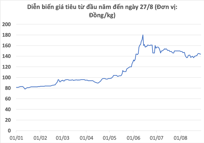 Giá tiêu những ngày gần đây quay trở lại đà tăng sau khoảng hai tháng điều chỉnh giảm. Tính đến ngày 27/8, giá tiêu giao dịch ở mức 144.000 đồng/kg, phục hồi từ mức đáy hai tháng thiết lập hồi giữa tháng 8 là 137.000 đồng/kg.