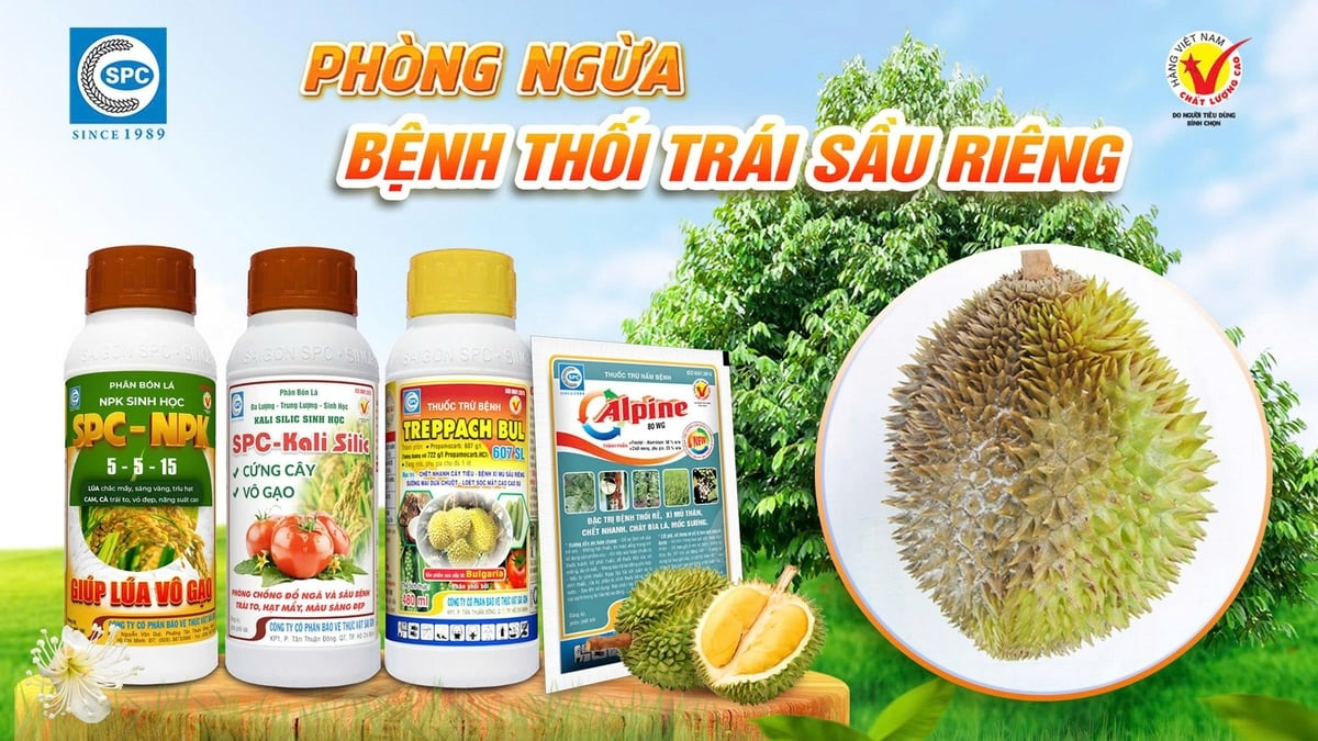 Các sản phẩm phòng ngừa bệnh thối trái sầu riêng hiệu quả của Công ty CP BVTV Sài Gòn - SPC. Ảnh: Minh Tuyên.