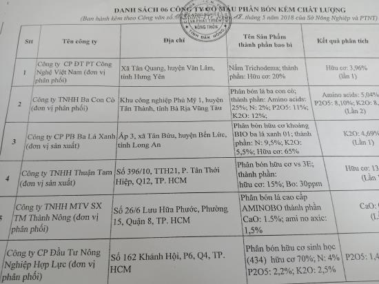 4.Phân bón hữu cơ vi sinh 3E do Công ty TNHH Thuận Tam (Phường Tân Thới Hiệp, Quận 12, TP Hồ Chí Minh sản xuất);3.Phân bón hữu cơ khoáng BiO Ba Lá Xanh 01 do Công ty Cổ phần phân bón lá Ba Lá Xanh (Ấp 3, xã Tân Bửu, huyện Bến Lức, tỉnh Long An sản xuất);