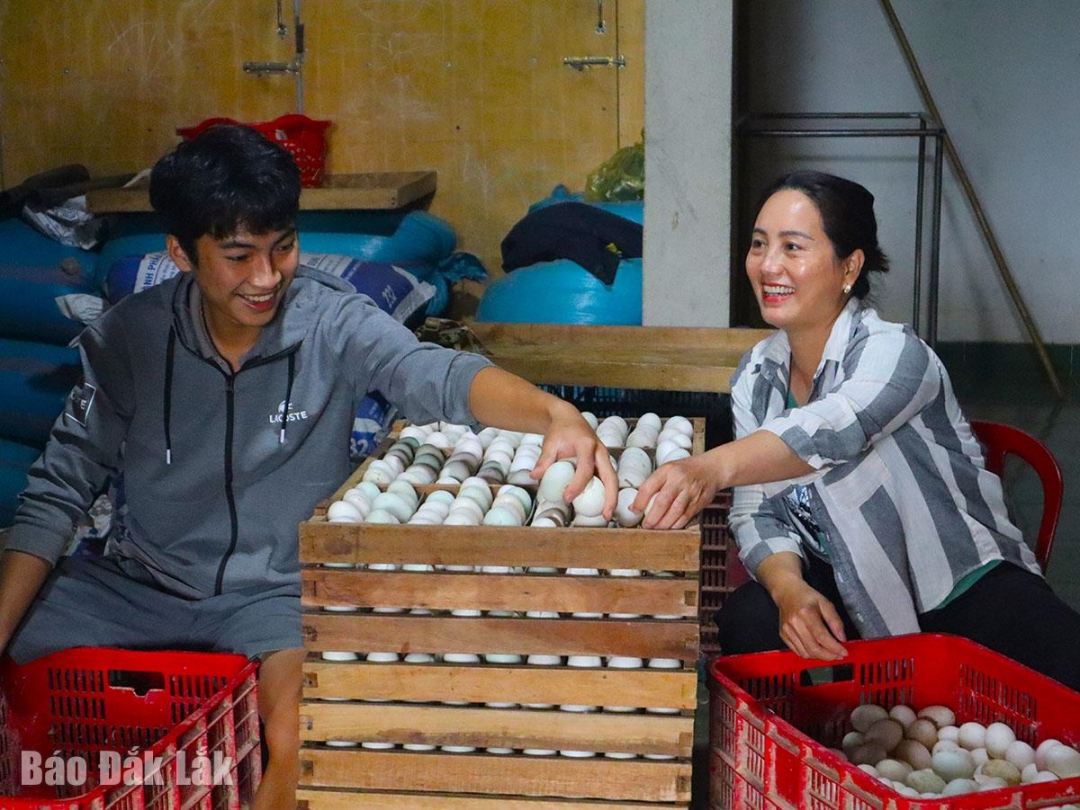 Có thể kể đến mô hình nuôi vịt đẻ trứng của gia đình chị Nguyễn Thị Hà ở thôn Buôn Tung 1. Hiện nay, với quy mô đàn vịt khoảng 10.000 con, khi đạt sản lượng tối ưu, gia đình chị có thể thu được khoảng 8.000 quả trứng/ngày. Với giá sỉ trứng vịt khoảng 3.000 - 3.100 đồng/quả, mỗi ngày gia đình chị thu về hơn 20 triệu đồng.